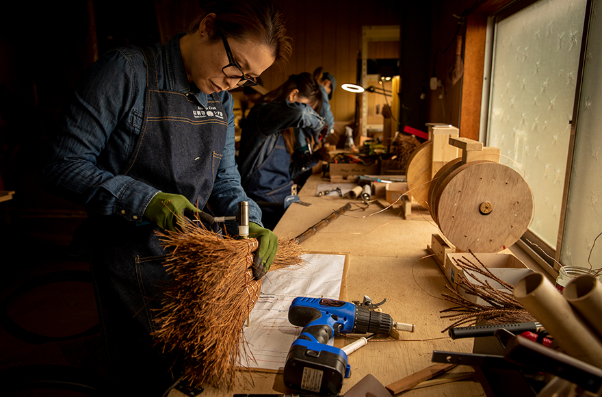 歴史ある箒の作り方をもとに、スタッフによって新たに生み出された当社独自の製法によって、職人が一つ一つ手作りで製作しております。
