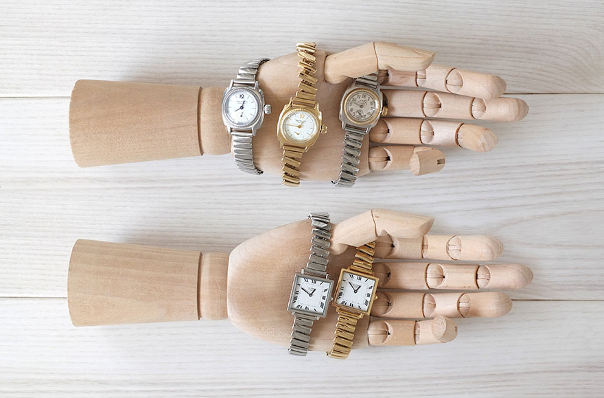 エクステンションベルトは1950年代のミッドセンチュリー期にアメリカンウォッチなどで多く見られた当時と同じ構造。コマの繋ぎ目がバネ式になっているため、金属のベルトながら伸縮自在です。ワンアクションで着脱が出来ますので ブレスレットなどのアクセサリー感覚でご着用いただけます。端正でありながら存在感のあるフォルムにローマ数字とのデザインが、高級感のある、上品かつアンティークな雰囲気を演出。ワントーンで構成される洗練された風貌はどんな服装にも合わせられますので、腕元に華やかさを添えるこの時計をぜひ手に取ってみてください。